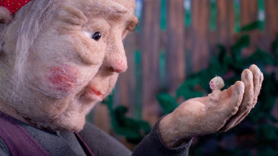The dream team that is Phoebe Wahl and Andrea Love have brought us a magical, wooly adaptation of Thumbelina. Already gaining festival selections and an Audience Award at the New York International Children’s Film Festival, it’s off to a great start and will be screening at Annecy Festival this summer! The stop-motion tale is set in a bountiful and enchanted forest that’s brimming with life. The soft scenery is filled with deep warm colours that offset nicely the pastels of our little hero Tulip, the 6-year-old born from a flower. We join the curious Tulip, straying from her docile home and follow her as she loses her way through the giant blades of grass and towering flowers. The felted set, characters and props are abundant and beautiful; flowing water, wildlife, glowing pink clouds, if I could live there, I would. It’s home to all sorts of funny and cute creatures that shape Tulip’s journey and help her on her way through the sprawling forest. The fashionista Frog describes Tulip as “a lovely centerpiece for my bonnet” and pops her on his head. Little jokes like these are sprinkled throughout and will be making lots of children giggle I’m sure.