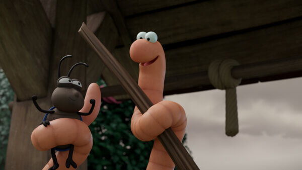 The first is a long sequence that was called ‘Rainy Day Bees’ during production and includes Superworm acting as a skipping rope for some bored bees, becoming a fishing line to rescue a tiny beetle stuck in a well. Superworm receives so much admiration from all the garden creatures for his feat that his ego explodes. It was a challenge sequence to get right because it contains a number of key story points and several shifts in energy and tone.