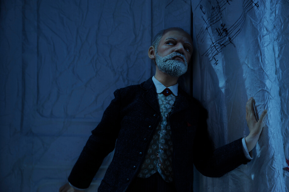 The idea was to do it with Moscow’s leading actor, but I knew little about the Jewish faith; I could not speak Russian; and certainly could not play the violin, or speak Russian, so I thought I’ll just do it – how far out of my comfort zone can I go! I had agreed to do it but sadly circumstances changed and we lost the momentum. Irina and I stayed in touch. She started a series called “Tales of the Old Piano” about classical composers. The others in the series are mainly CG and are filled with colourful backgrounds and multiple characters which are easier to accomplish in CG. For a stop motion film, though, the budget was small and only allowed me a single puppet, and one set – but as is so often the way, these restrictions also force inspiration. I only had 13 minutes to do justice to Tchaikovsky. I had to think about bringing in the other necessary characters in his story, but without physically building them. Luckily, photography was reasonably sophisticated at the time, and his life was well documented. Projections seemed an appropriate and practical way to feature these characters, and led me down the path of a narrative about memory.