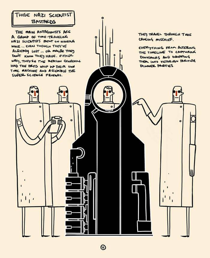 Brett: One of my favourite characters we’ve come out with is Z3, which is based on the first electronic computer created by the Germans in World War II. It was destroyed when allies bombed Berlin but in our universe we’ve decided to take that character and say when he is turned on he becomes self aware like Skynet, but then he defects and decides to go work with the British for Churchill. His story gets convoluted and awesome because of the time travel. Basically in every eventuality no matter what they do in time, Z3 ends up taking over and deciding, like every AI, that humanity is insufficient and ends up taking over the world. However in the present he’s a good guy, but has a bit of Dr. Strangelove about him, as he would obviously have a German accent so nobody knows were he stands. Ada Loveless, who came up with these computer algorithms and was a maths wiz, becomes Z3’s kind of love interest as she the only one that can get to him so. She’s part of the resistance to overthrow him in the future, so there a scene in the graphic novel which we have as a reward, where Z3 has a computer virus and she comes back to save him. It’s a very convoluted storyline but no matter what happens in history the Super Science Friends manage to get things back to almost normal.