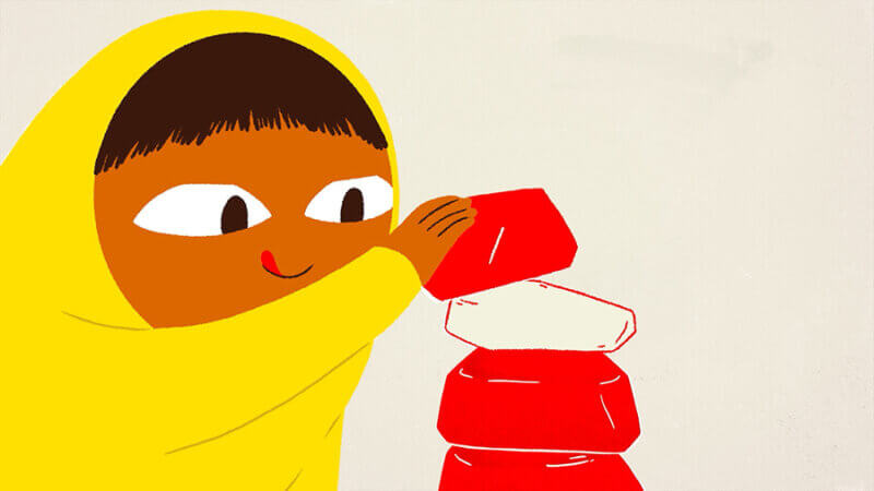 I like to think about how the visual style of a film can enhance the story. I was drawn to primary elements, in shape and emotion and colour, to create a world that is easy to get drawn into. Yellow, red, blue. Sun and moon, light and dark. Square, circle, triangle. House, mountain, lake, rocks. Wind, water, land.