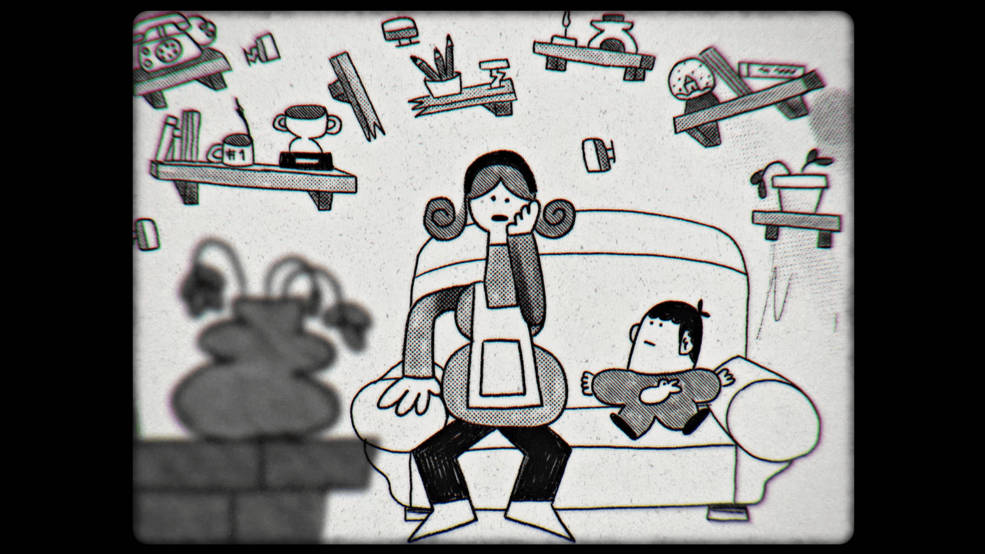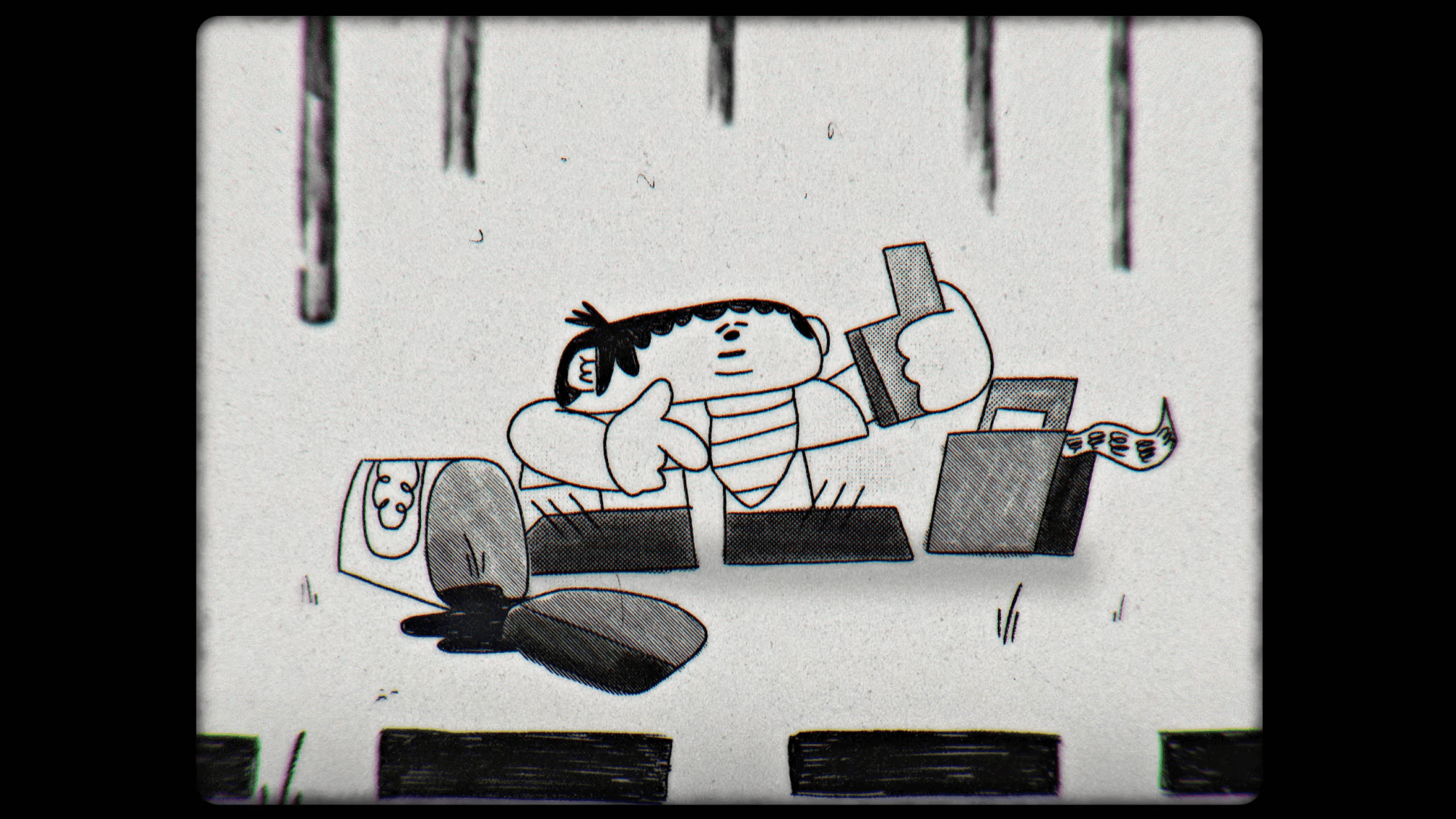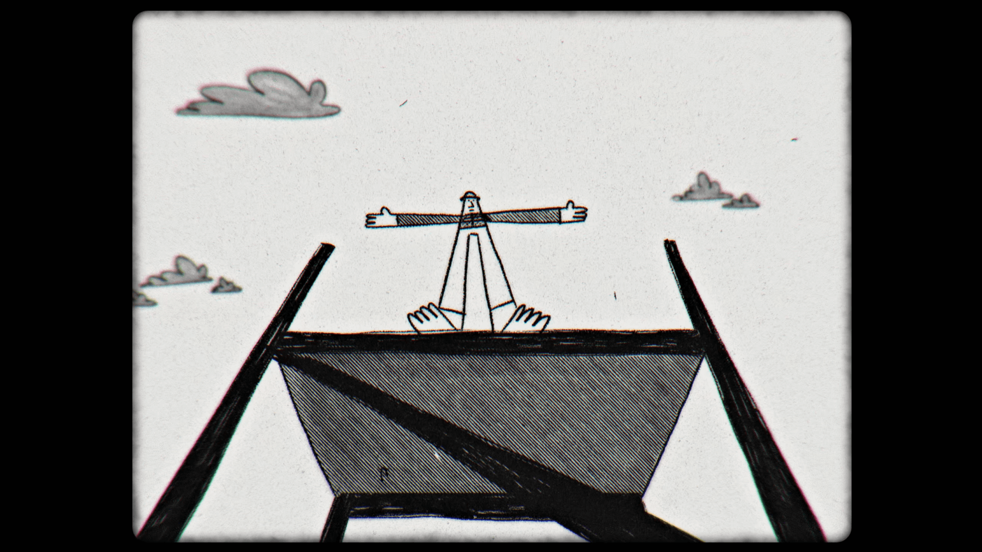 My work is mainly born out of functionality and essentialism. I am one person making work in the tiny gaps of free time I can grab during the 9/5 work week. I really just got into my head that the idea is everything. The visuals are just an aid to help the idea stand up properly as best it can. I wanted to disarm the audience of prejudice before coming into the animation, so I thought if I designed the animation to look raw, sore and broken from the beginning, any small missing details and technical errors would sit in harmony with the style. The stereotype of animation is that it is for children, so to counteract that I just leaned into it with the character and set designs. Wobbly lines, building block bodies and overly expressive key poses. People think the intent of the animation is to make them laugh and hopefully, they believe that until it hits a point where they slowly realise I want to say a little bit more.