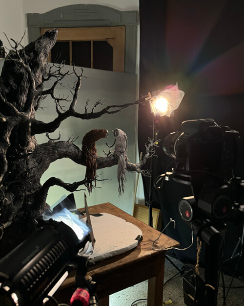 As well as animated films, you’ve produced stunning standalone pieces and posed illustrations using puppets. Does this go hand in hand with how you approach animated storytelling, or is it its own separate skillset to tell stories in single, static images?