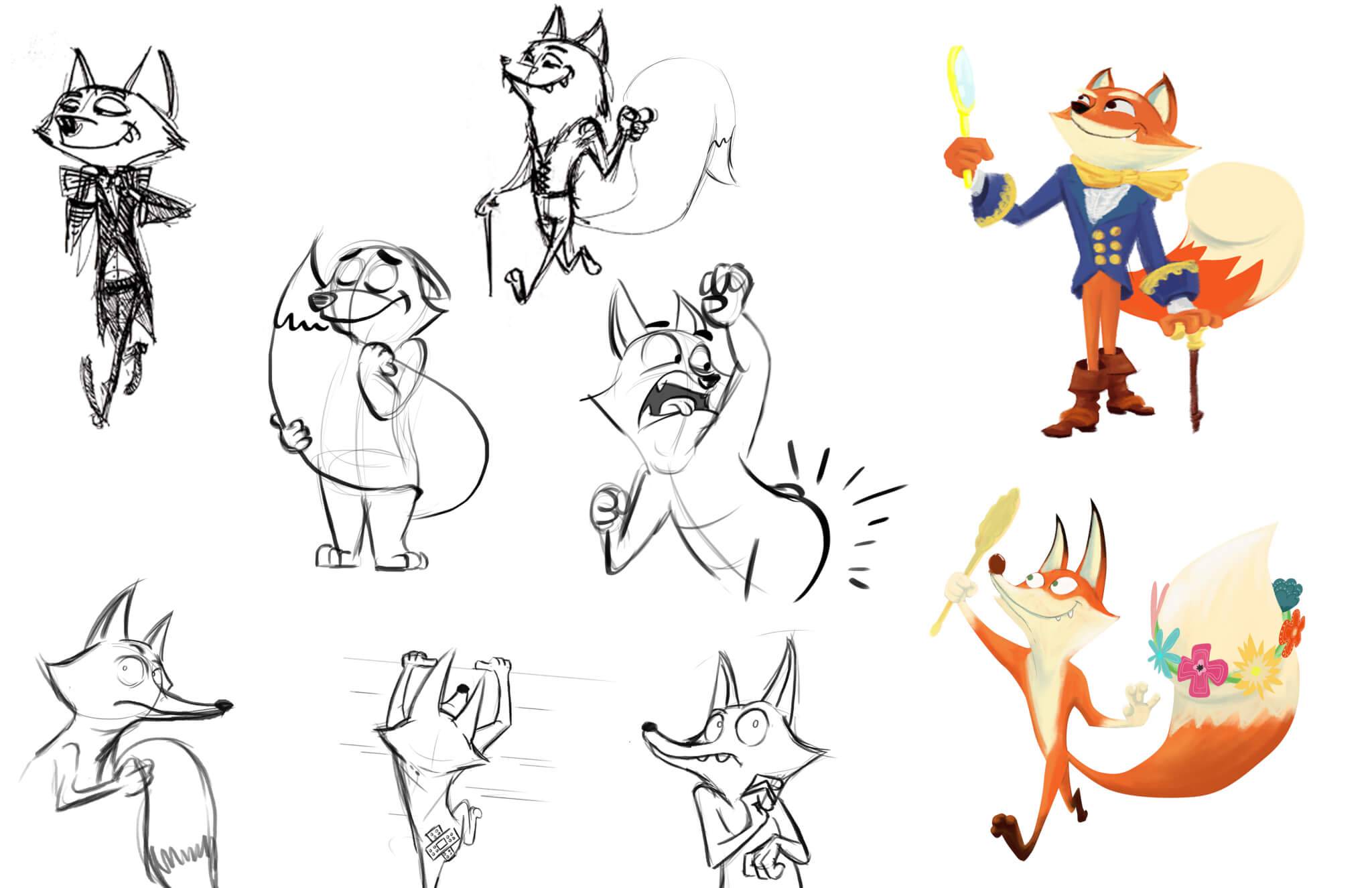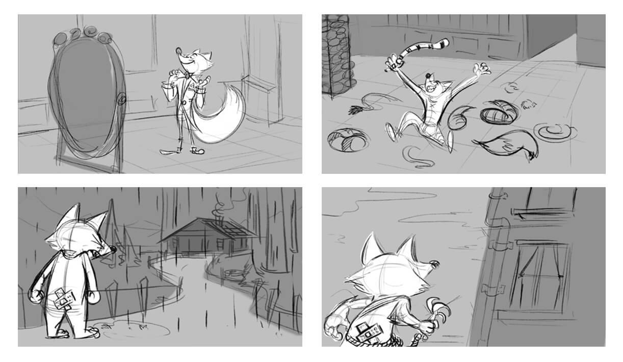 I started with just a rough idea of the main character. Before writing the whole story for the short film, I imagined this character in a specific setting interacting with objects in the surrounding environment. I asked myself how Mr. Fox would react to a mirror, given how enamored he is of his own tail. If he found a number of beautiful tails lying around, what would he do with them? I answered these questions on paper by drawing a few storytelling images. The drawings made the character come alive visually and allowed me to put the puzzle of the story together, image by image. In time, it became very clear to me who Mr. Fox was as a character—a vain teenager who is callous about others’ feelings.