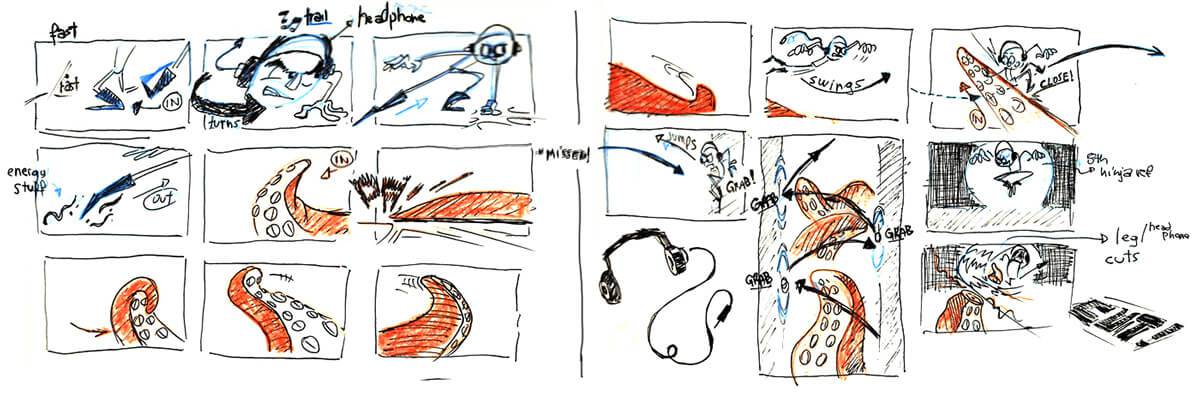 You are right, it’s a collaborative piece. There wasn’t a lot of actual goals other than explore and push our cel character animation in a character-driven piece. Everybody was happy to start working from the first thumbs, which presented a guy jumping around while being chased by a huge tentacle. The tentacle was an interesting obstacle because it would move in a more organic, fluid way, in opposition to the character, which could have sharper and quicker moves. On top of that, we added the idea that the tentacle was actually his meal, and that helped bring a bit more depth to the story, giving it a nice little “plot twist”, so the viewer feels it’s not only a cool piece to look at, but it also pays off in the end.