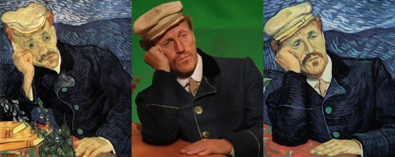 Live-action footage (middle) used as reference for animation painting (right) to evoke Van Gogh’s 1890 Portrait of Dr. Gachet (left)