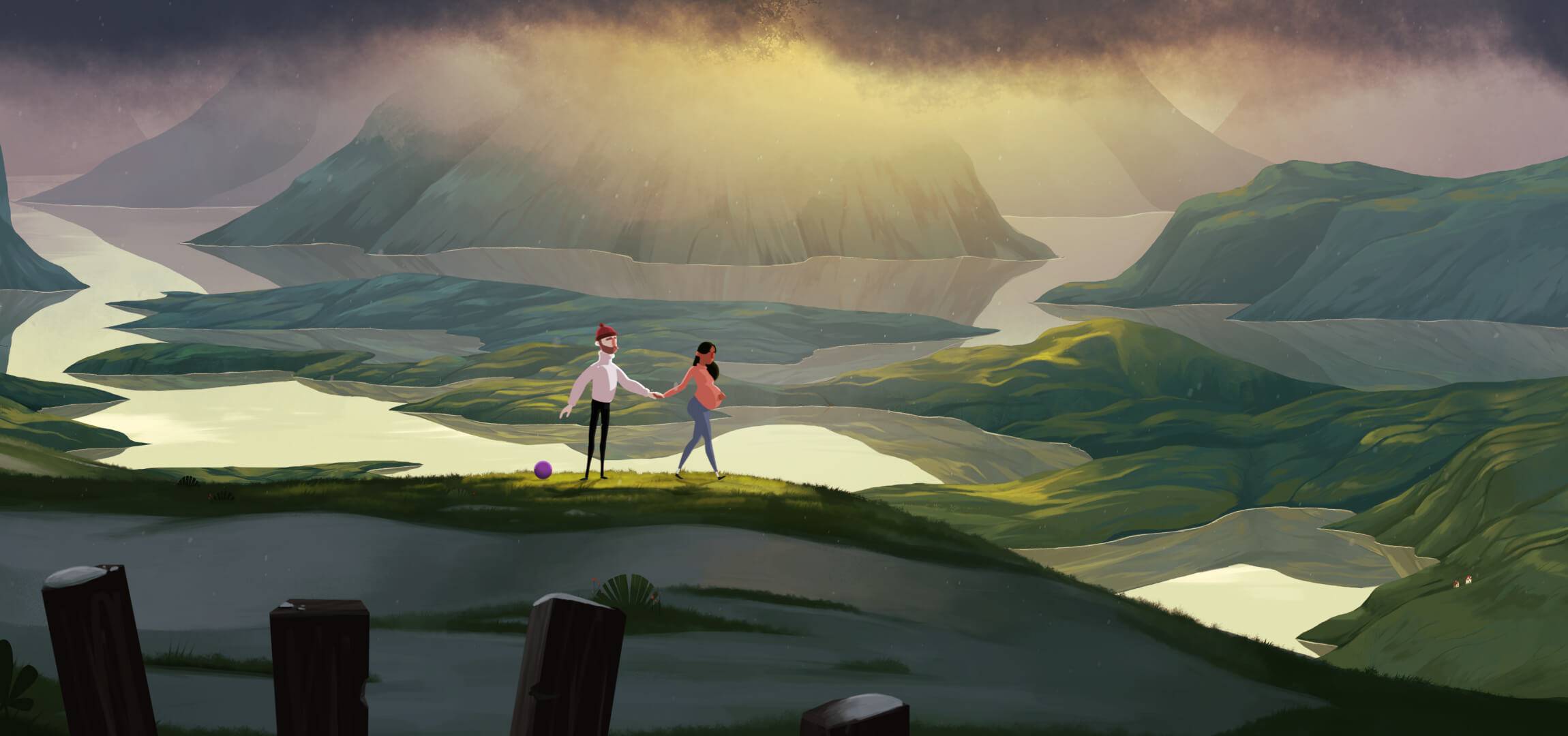 The first thing I did with this film, before it was even a full idea, was sketch out tiny thumbnails of landscapes. I just wanted to draw as many different types of landscapes as possible, so it looked like they had travelled far and also out of a selfish thought that I really wanted to try paint up a variety of things. The variety of environments has led everyone to believe they are in the USA and I spent 2 years of my childhood in America, so I’ve always had this weird internal pull towards it, I even still spell Mom with an ‘o’. I wanted them to be environments that were stylised but had some root in the real world. It was tricky to make sure they were coherent, as I drew the night background first with the lake, I then had to work out what sand and snow looked like in the style.I had to go back and change a lot of rocks because I’d drawn them one way, but when I came across a background with lots of rocks the detail I had given the rocks in previous shots was too much for the current shot. It was a back and forth, and there were some locations that just weren’t working even after I’d got to the final stage of animating all the tiny background pieces … so there were times when I just started over to get a better composition, colour and feel. I’m really glad I didn’t just settle for any of the backgrounds, I really questioned them all throughout; at some points to the extreme where I was asking myself was the film going to be any good at all?