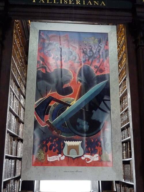 The illustrations are hung on banners, moving down the room in a timeline, facing their written counterparts on the opposite side of the Library. Drawn in Tom Moore’s graphic style and rendered in vibrant colour, the graphics vividly bring to life the drama and emotion of Brian’s story; his uniting of the Irish people and the epic struggle to rid Ireland of the Viking settlers, making this exhibition so much more than just another dry old history.
