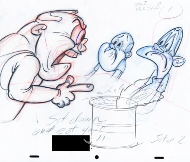 We had a really elaborate system when we were first doing the Flash cartoons: Drew everything in pencil, inked it, but once we turned it into vector art, it would destroy the lines, make them look weird. So we had to add a step called ‘Optimisation’ where I had a whole army of people who would take the screwed-up vector lines and move those little points around to make it look like the original. That was expensive and time-consuming – and irritating – but I don’t have that problem anymore, I can just draw in ToonBoom. The brush is so good in ToonBoom that when I do a line it’s like a finished ink line, it eliminates all the stages in between the pencil line and the inking. Not only is it faster, it looks better.
