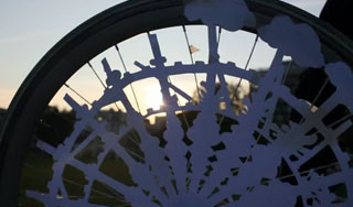 Yeah there was things to work out with the frame rate of the camera and the rotation of the wheel, basically the more segments around the wheel the slower the bike would need to be traveling to animate. Once I had the disc drawn out and divided up into segments it was just a case of drawing out really basic looping animations. The biggest challenge I found myself faced with was how to attach a camera to the moving bike frame securely. The camera would have to be moving at the same speed at the bike and both would have to be as steady as possible. I went through all sorts of possibilities; filming from another bike, filming from a skateboard or car, but all these would have too many variables. In the end I managed to construct an arm secured to the bike using a clamp. I was using my Cannon 550D DSLR as its really light weight so was much easier to support though riding so fast with it clamped on still scared me to death!