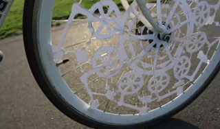 My aim was to keep it as aesthetically clean as possible to make sure the focus was solely on the technique and the viewer was not distracted by narrative or anything else. I’d worked previously for artists such as Rob Ryan and really liked the way paper cut silhouettes allow for a really clean aesthetic but with quite complex design. After the early tests I realized to really make it clear that these animations were happening in real time I would have to film it on moving bikes not just an upside down wheel (though the latter makes for cleaner animation). For the cutouts themselves I went down to the museum of childhood in Bethnal Green, East London which has some amazing optical toys, the phenakistoscope they had on display (those discs with the slits cut round the edge that you spin in front of a mirror) gave me a good idea of what kind of shapes and structures would animate best and how they could interact.